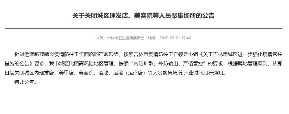 吉林市卫生健康委员会网站消息,吉林市城区比照高风险地区管理,按照“内防扩散、外防输出、严格管控”的要求,根据属地管理原则,从即日起关闭城区内理发店、美甲店、美容院、浴池、足浴(足疗店)等人员聚集场所,开业时间另行通知。详情>>