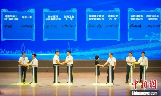 活动现场,蓝思科技股份有限公司与湖南省汽车技师学院、盐津铺子食品股份有限公司与湖南农业大学、长沙惠科光电有限公司与湖南工业大学、湖南华纳大药厂有限公司与南华大学分别签订合作协议。中国科学院院士、北京大学原校长周其凤回到家乡,与参会青年朋友们分享了两位北大校友的创业故事。