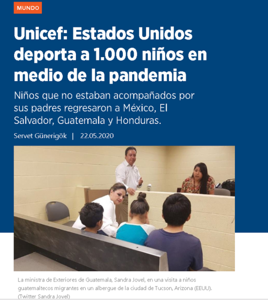 联合国儿童基金会表示,这部分至少1000名的移民儿童是处于无人陪伴的状态下,被遣送回墨西哥、萨尔瓦多、危地马拉和洪都拉斯。