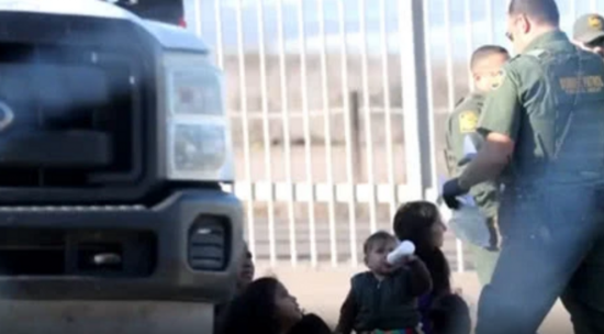 △美国边境CBP工作人员和在喝奶的移民儿童