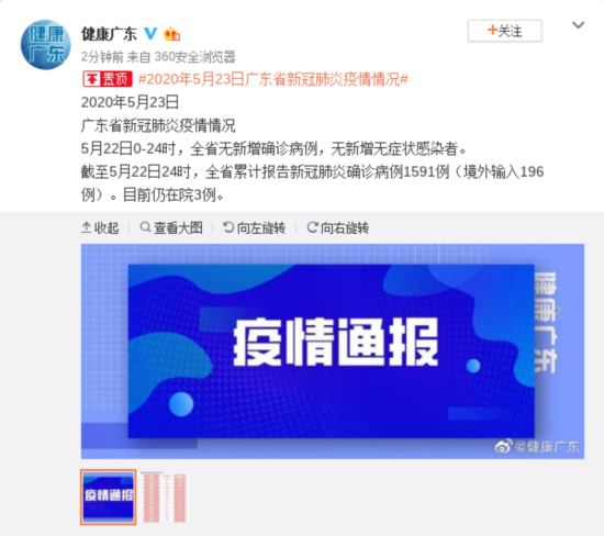截至5月22日24时,全省累计报告新冠肺炎确诊病例1591例(境外输入196例)。目前仍在院3例。