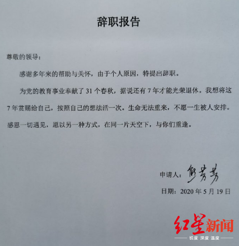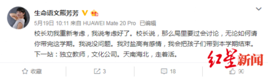红星新闻记者在微博认证为教育博主“生命语文熊芳芳”的账号上看到了这封辞职信。5月22日,记者电话联系上熊芳芳,她向记者确认了微博内容及这封辞职信,并表示自己目前还未离职,正在走相关离职手续。