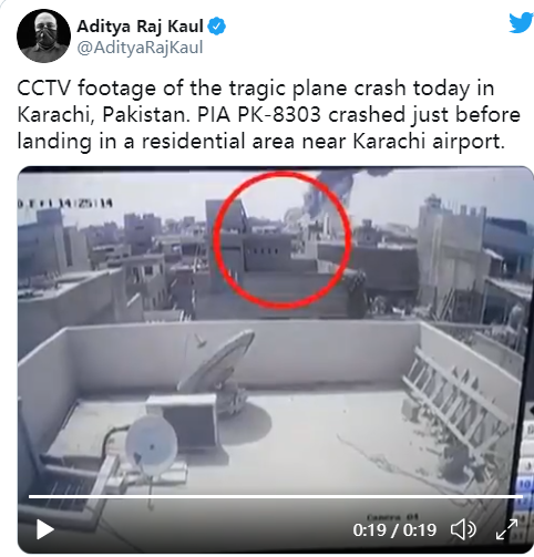 根据印度媒体BTVI编辑阿迪亚·拉杰·考尔(Aditya Raj Kaul)在个人社交媒体上转发的视频显示,该航班从画面右上方一路向下滑往居民区,坠毁后引发大量浓烟和火光。