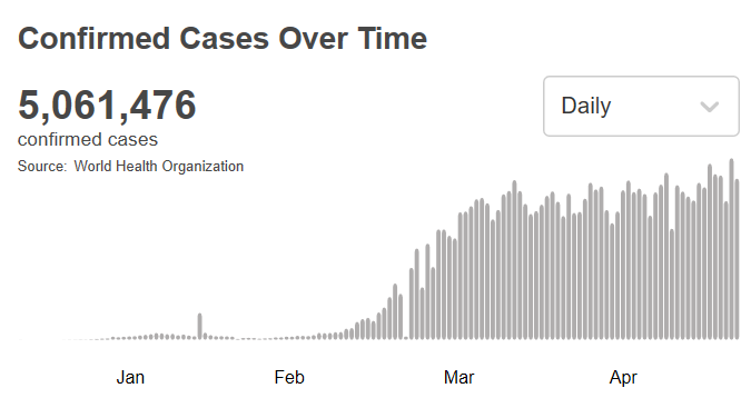 根据世卫组织最新实时统计数据,截至欧洲中部夏令时间5月23日9时32分(北京时间5月23日15时32分),全球确诊新冠肺炎5061476例,死亡331475例。
