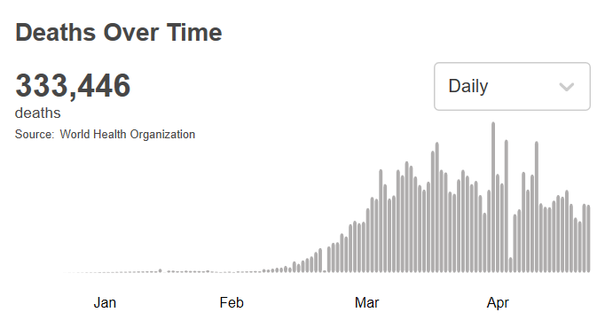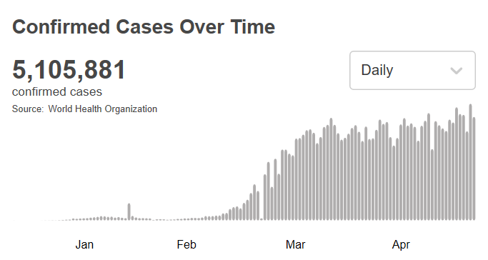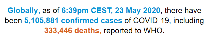 根据世卫组织最新实时统计数据,截至欧洲中部夏令时间5月23日18时39分(北京时间5月24日0时39分),全球确诊新冠肺炎5105881例,死亡333446例。