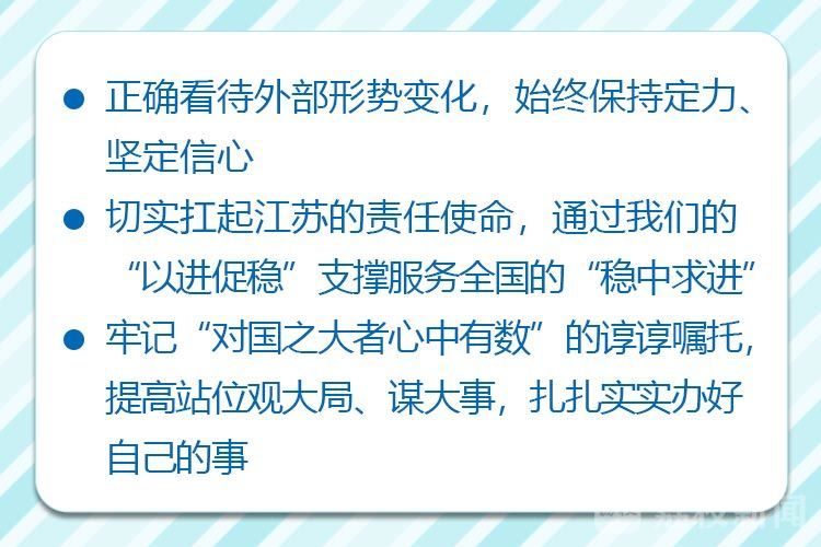 娄勤俭在发言时说,习近平总书记强调要坚持用全面、辩证、长远的眼光分析当前经济形势,努力在危机中育新机、于变局中开新局,为我们更好地看清形势、做好工作进一步指明了方向。对于江苏来说,一要正确看待外部形势变化,始终保持定力、坚定信心。越是这样的变化变局中,越是要增强“四个意识”、坚定“四个自信”、做到“两个维护”,越是要坚定不移听从以习近平同志为核心的党中央号令,越是要坚定人间正道在我们脚下、胜利必定属于我们的信心。二要切实扛起江苏的责任使命,通过我们的“以进促稳”支撑服务全国的“稳中求进”。要深入贯彻中央决策部署,围绕以国内大循环为主体、国内国际双循环相互促进的新发展格局,把“六稳”“六保”任务落实落到位,对完善内需体系、畅通经济循环、提升产业链供应链的竞争力作进一步研究谋划、形成清晰的推进路径,切实抓出成效,走在全国前列。三要牢记“对国之大者心中有数”的谆谆嘱托,提高站位观大局、谋大事,扎扎实实办好自己的事。深刻理解党中央所关心强调的事情和两会审议的议题,都事关国家主权、安全、发展利益,做到头脑特别清醒、态度特别鲜明、行动特别坚决、落实特别有力。