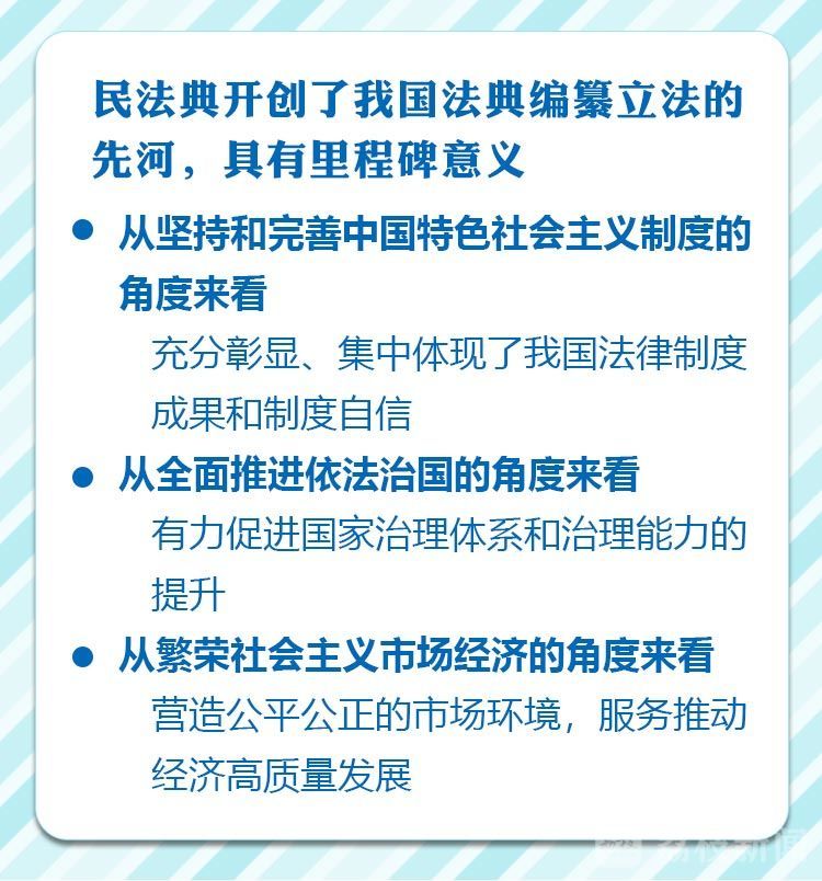 在审议民法典草案时,娄勤俭说,民法典是新中国第一部以法典命名的立法,开创了我国法典编纂立法的先河,具有里程碑意义。从坚持和完善中国特色社会主义制度的角度来看,民法典运用马克思主义国家和法的理论,根植于中华民族深厚的历史文化和传统,充分彰显、集中体现了我国法律制度成果和制度自信。从全面推进依法治国的角度来看,民法是民事领域的基础性、综合性法律,以“法典”的方式呈现,体系化、系统化集成民事法律制度,有利于更好地以良法保善治,有力促进国家治理体系和治理能力的提升。从繁荣社会主义市场经济的角度来看,通过编纂民法典,进一步完善民事商事领域基本法律制度和行为规范,能够充分调动各类市场主体的积极性创造性,营造公平公正的市场环境,服务推动经济高质量发展。