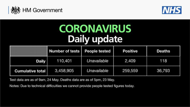 当地时间5月24日9时,英国首相约翰逊表示,英国新冠肺炎单日新增死亡病例118例,累计死亡36793例。单日确诊病例新增2409例,累计确诊259559例。