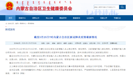 截至2020年5月25日7时,内蒙古自治区累计报告输入本土确诊病例2例,治愈出院2例;境外输入确诊病例150例(俄罗斯100例、英国23例、法国19例、美国4例、西班牙2例、瑞典2例),治愈出院125例。现有境外输入确诊病例25例、疑似病例1例。