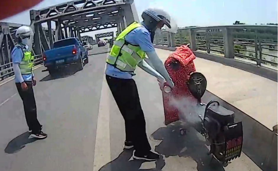 由于地处船闸闸桥,车辆较多,为防止发生交通拥堵,司刚、朱帅先在灭火的同时,对过往车辆和人员进行疏导。在几名辅警的共同努力下,仅仅用了50秒,就快速控制了电动自行车冒烟点,后经查看发现可能是电动自行车电源线路老化所致。
