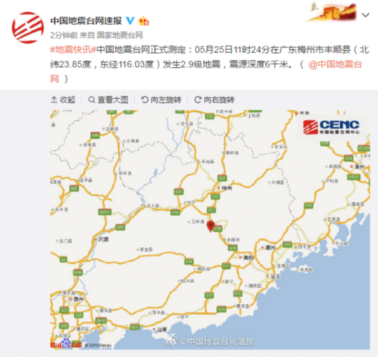 中国地震台网正式测定:05月25日11时24分在广东梅州市丰顺县(北纬23.85度,东经116.03度)发生2.9级地震,震源深度6千米。