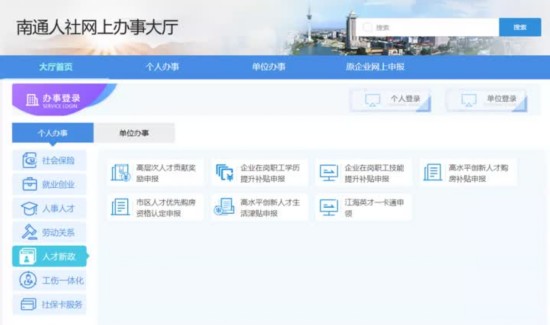 去年以来,为加快人才新政落地,让各类人才得到优质精准服务,南通市人社局开始打造集成式、系统化、综合性的人才服务平台。5月,人才新政网上综合服务大厅正式上线运行,以人才新政“一件事”为入口,设置企业在岗职工学历技能提升、高水平创新人才生活补贴和购房补贴申请、高层次人才贡献奖励申报、江海英才一卡通申领、本科毕业生(技师)综合补贴、海外高层次人才个税奖励申报、院校培养输送奖励申报等13项服务事项,“不见面”接处涉及企业用工和高校毕业生就业的各类咨询、求助、投诉,无障碍接受人才、企业等综合补贴、推荐奖励、实习补贴申报。