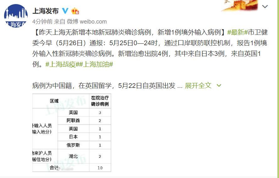 荔枝新闻讯 上海市卫健委今早(26日)通报:5月25日0—24时,通过口岸联防联控机制,报告1例境外输入性新冠肺炎确诊病例。新增治愈出院4例,其中来自日本3例,来自英国1例。