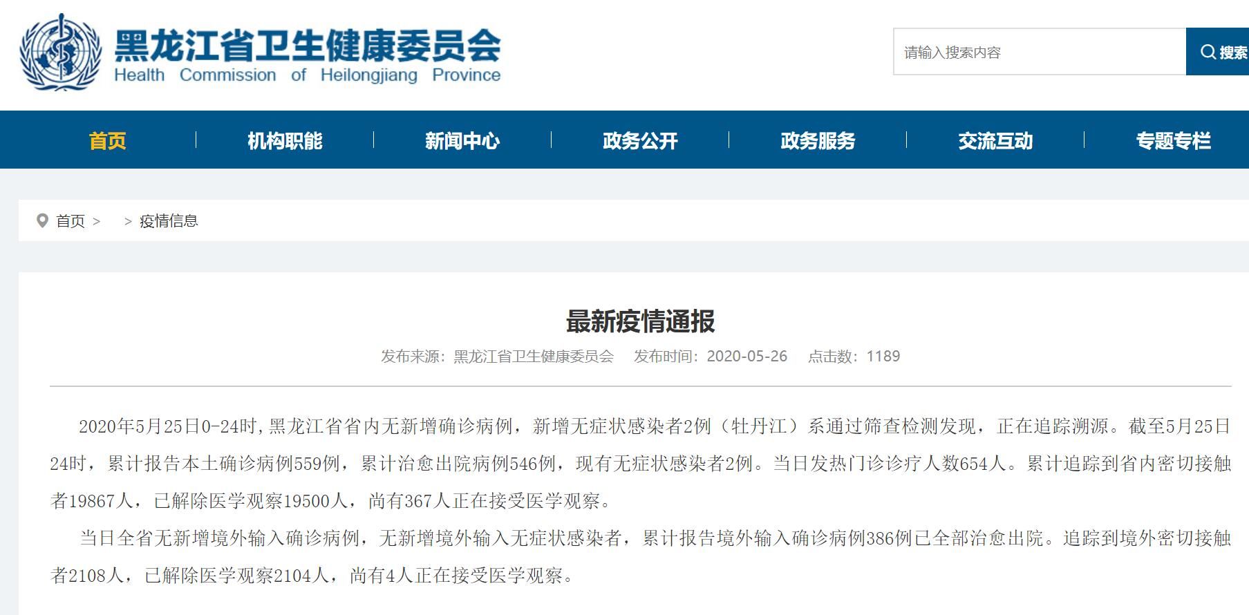 荔枝新闻讯 据黑龙江卫健委官网消息,2020年5月25日0-24时,黑龙江省省内无新增确诊病例,新增无症状感染者2例(牡丹江)系通过筛查检测发现,正在追踪溯源。截至5月25日24时,累计报告本土确诊病例559例,累计治愈出院病例546例,现有无症状感染者2例。当日发热门诊诊疗人数654人。累计追踪到省内密切接触者19867人,已解除医学观察19500人,尚有367人正在接受医学观察。