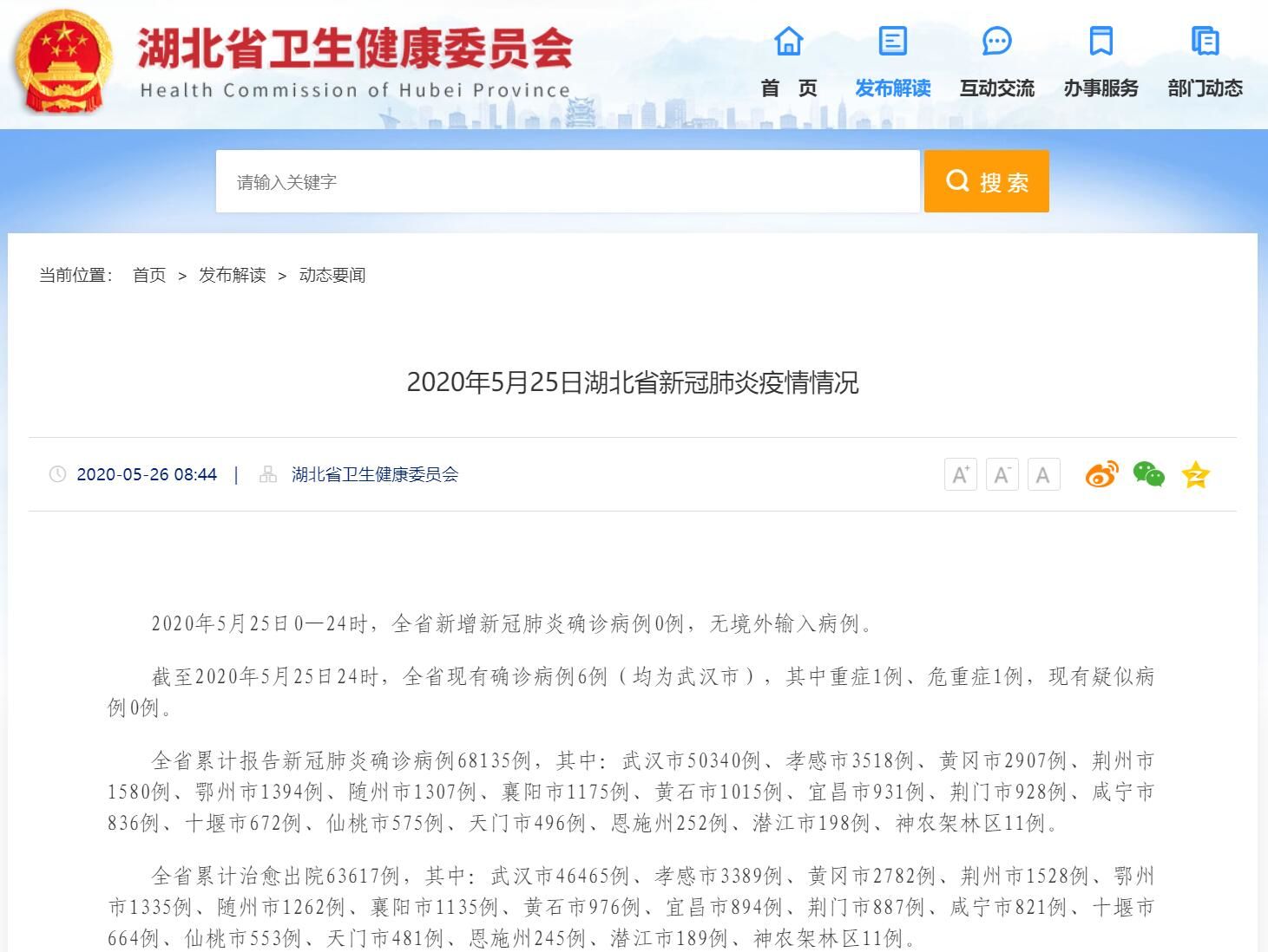 截至2020年5月25日24时,全省现有确诊病例6例(均为武汉市),其中重症1例、危重症1例,现有疑似病例0例。
