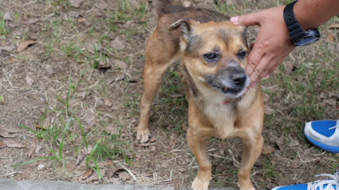 这只毛发黄黑相间的公狗,看起来像中华田园犬,但四肢短小,可能是杂交狗。一开始,它很怕生,只在医院门诊楼外徘徊,不敢进来。