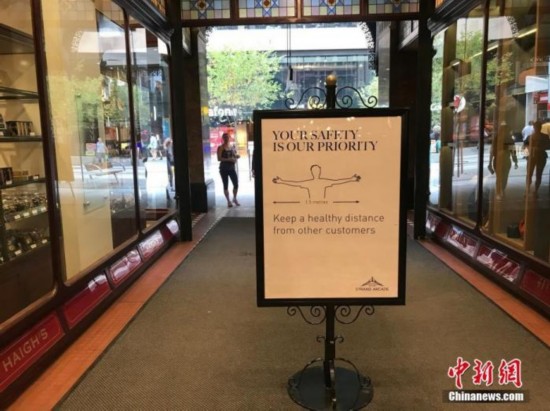 资料图:当地时间5月9日,悉尼的一些商铺已重新开业,吸引民众逛街购物。图为商业中心内,“保持社交距离”的提示十分醒目。 中新社记者 陶社兰 摄