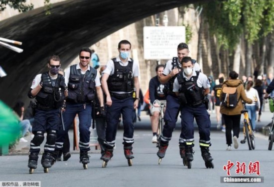 5月11日,法国开始逐步“解封”,结束已经持续55天的全国“封城”状态。当地时间5月13日,法国巴黎,塞纳河沿岸警察穿着旱冰鞋巡逻。
