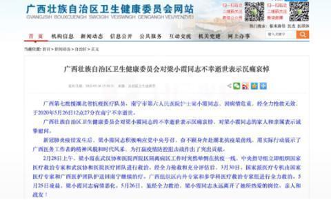 广西壮族自治区卫生健康委员会(以下简称“广西卫健委”)5月26日通报,广西第七批援湖北省抗疫医疗队员、南宁市第六人民医院护士梁小霞,因病情危重,经全力抢救无效,于2020年5月26日12点27分在南宁不幸逝世。