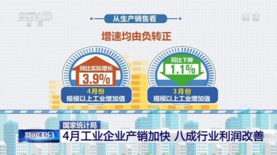 从生产销售看,4月份,规模以上工业增加值同比实际增长3.9%,3月份为下降1.1%;增速均由负转正。工业企业营业收入同比增长5.1%,3月份为下降11.1%,规模扩张效益有所显现。