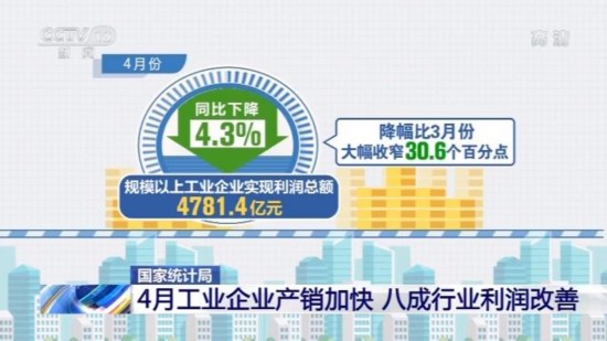 数据显示,4月份,规模以上工业企业实现利润总额4781.4亿元,同比下降4.3%,降幅比3月份大幅收窄30.6个百分点。