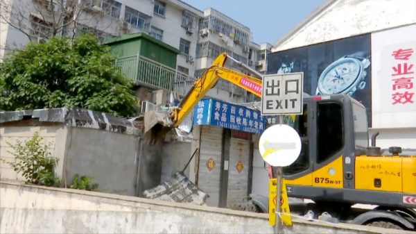 近日,记者在淮海东路苏果超市东侧看到,市城管局的工作人员正在对违法搭建、违法占用的建筑物进行拆除。
