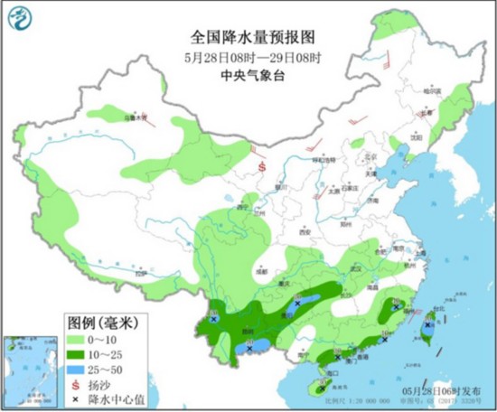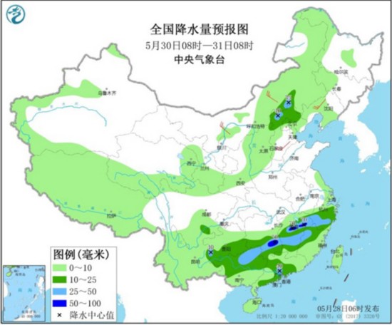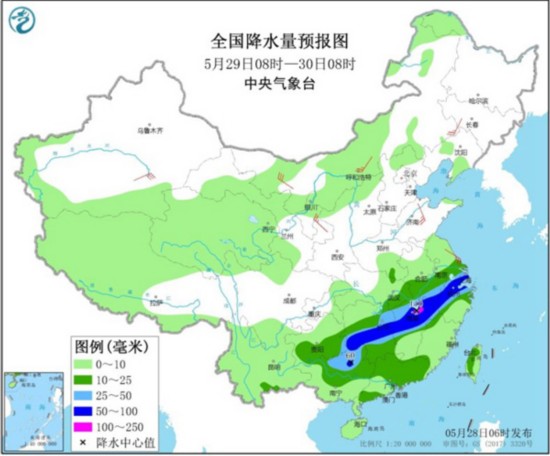 5月29日08时至30日08时,江淮西部、江南大部、西南地区东南部、华南中北部等地的部分地区有中到大雨,其中,安徽南部、上海南部、湖南中部、江西中北部、浙江中北部、广西东北部等地的部分地区有暴雨或大暴雨。