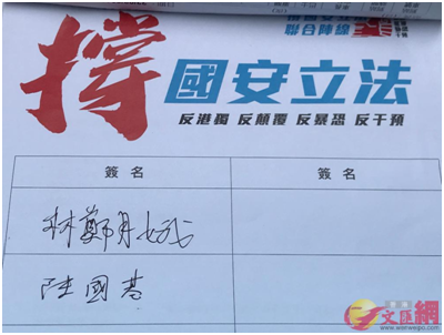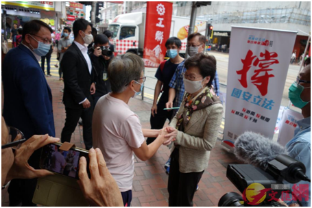 “香港各界撑国安立法联合阵线”(联合阵线)5月24日发起联署行动,在网上及街站(街边摊位)收集市民签名,支持“港区国安法”立法。据香港“大公文汇全媒体”报道,香港特区行政长官林郑月娥今日(28日)中午赴北角的一个街站签名,支持“港区国安法”。