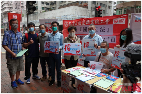 “香港各界撑国安立法联合阵线”于5月24日成立,并于当日发起“撑国家安全立法”签名行动。联合阵线在全港设置街站,并同步在网上收集市民签名,支持“港区国安法”。该活动将持续到5月31日,主办方希望活动能让广大市民一同撑国家安全立法,让香港早日重回正轨。