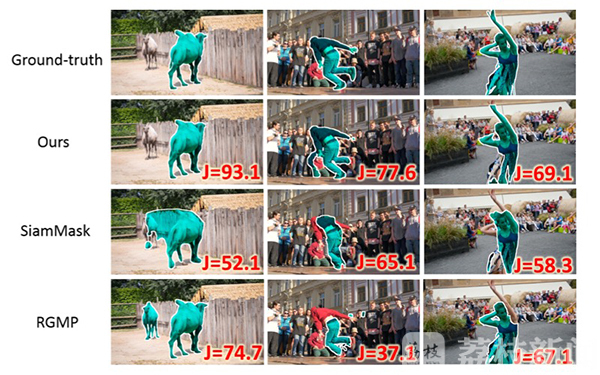 运用不同方法进行视频对象分割的效果。下图由上到下依次为官方提供的真实值、西浦团队提出的方法、SiamMask算法和RGMP算法,J值越大精确度越高。
