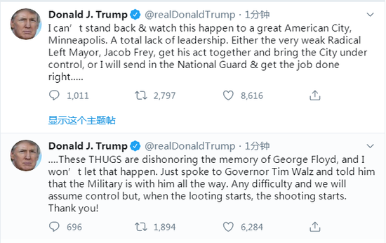 “这些暴徒(THUGS )正在玷污对乔治·弗洛伊德的记忆,我不会让这种事发生。我刚刚和(明尼苏达州)州长沃尔兹(TimWalz)通话,告诉他军队一直支持他。无论遇到任何困难,我们都能控制局面,但是,当抢劫开始时,射击就开始了。谢谢你!”