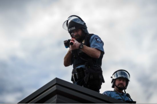 27日,明尼阿波利斯第三区警察局楼顶,两名荷枪实弹的警察将枪口瞄准示威者。↓