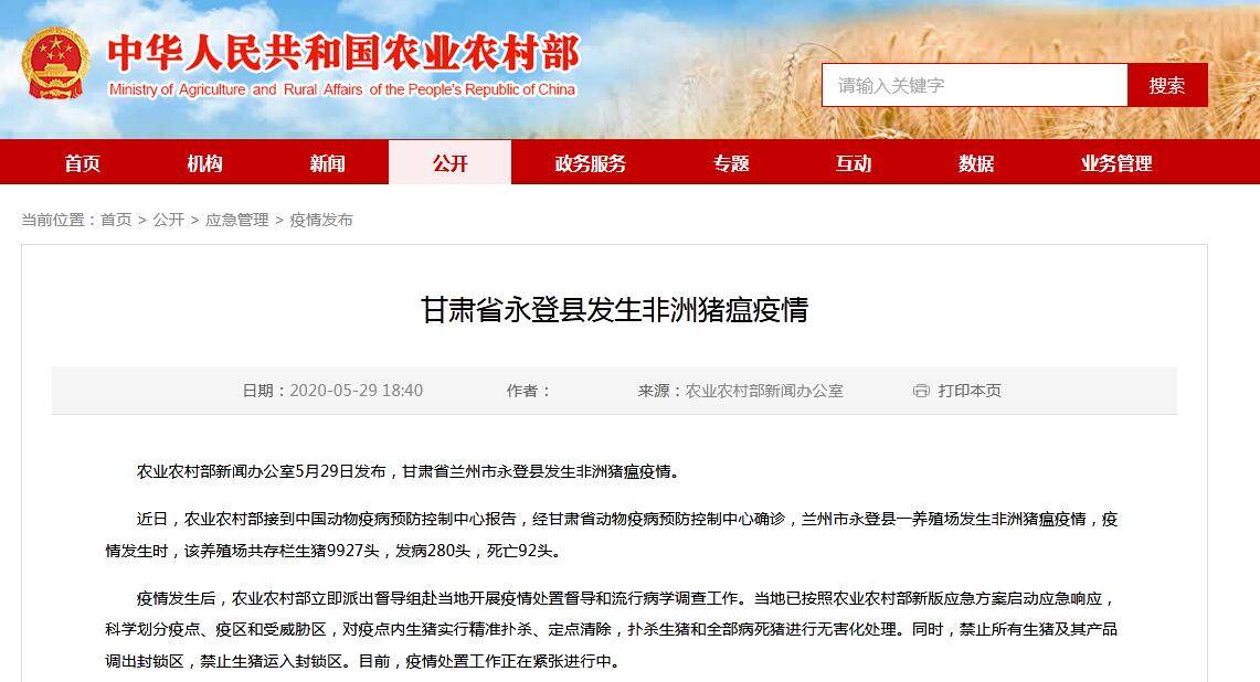 农业农村部新闻办公室5月29日发布,甘肃省兰州市永登县发生非洲猪瘟疫情。