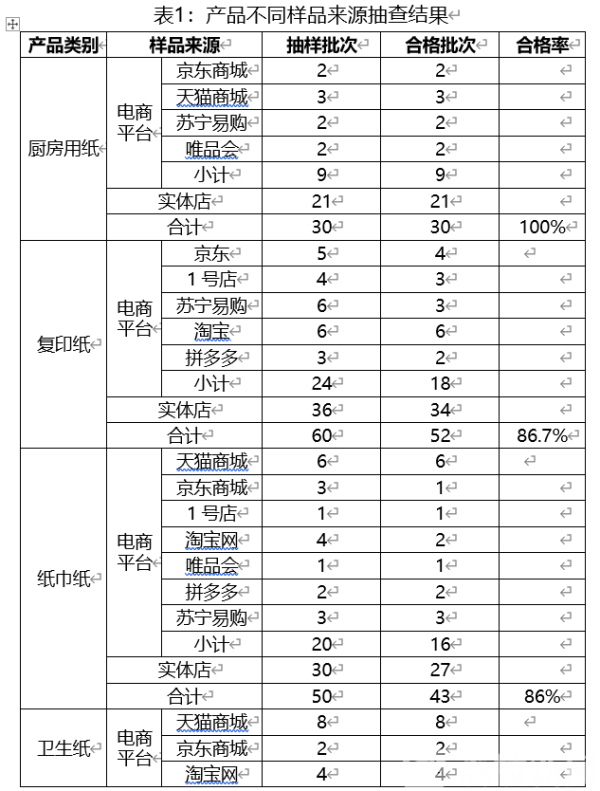 记者今天(5月29日)从省市场监管局获悉,2020年1季度,江苏省市场监管局组织对厨房用纸、纸巾纸、卫生纸、复印纸等4种纸类产品质量进行了监督抽查。共抽查厨房用纸、复印纸、纸巾纸、卫生纸等4种纸类产品190批次,其中合格173批次,平均合格率为91.1%。按抽样渠道统计,在实体店购样117批次,合格110批次,平均合格率为94%;在电商平台购样73批次,合格63批次,平均合格率为86.3%。按产品种类统计,抽查厨房用纸30批次,合格30批次,合格率为100%;抽查复印纸60批次,合格52批次,合格率为86.7%;抽查纸巾纸50批次,合格43批次,合格率为86%;抽查卫生纸50批次,合格48批次,合格率为96%。