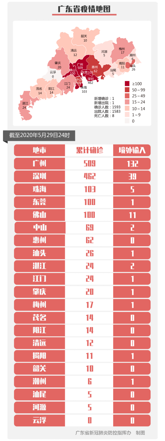 荔枝新闻讯 5月29日0-24时,全省新增境外输入确诊病例1例,广州报告,来自孟加拉国,在入境口岸发现,入境后即被隔离观察。新增出院1例。