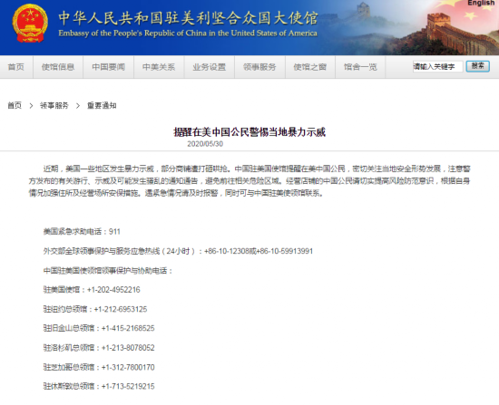 近期,美国一些地区发生暴力示威,部分商铺遭打砸哄抢。中国驻美国使馆提醒在美中国公民,密切关注当地安全形势发展,注意警方发布的有关游行、示威及可能发生骚乱的通知通告,避免前往相关危险区域。经营店铺的中国公民请切实提高风险防范意识,根据自身情况加强住所及经营场所安保措施。遇紧急情况请及时报警,同时可与中国驻美使领馆联系。