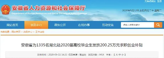 多地为湖北籍高校毕业生发补贴 安徽省人社厅网站消息,为贯彻落实国务院办公厅《关于新冠肺炎疫情影响强化稳就业举措的实施意见》(国办发〔2020〕6号)精神,加大对在皖就学湖北籍2020届高校毕业生的就业帮扶力度,安徽省人力资源社会保障厅、省教育厅、省财政厅为1335名湖北籍2020届高校毕业生发放200.25万元求职创业补贴,已经于4月30日全部发放到位,每人1500元。