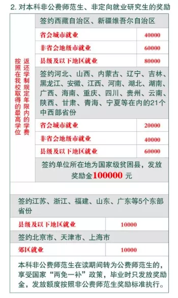启航计划的支持对象不限于公费师范生。对到中西部地区任教的本科非公费师范生、非定向就业研究生,按照其在学校取得的最高学位,返还学制规定年限内的学费,并给予一定奖励。如签约单位所在地为国家级贫困县,发放奖励金10万元。对建档立卡贫困家庭及其他家庭经济困难毕业生实行额外帮扶。