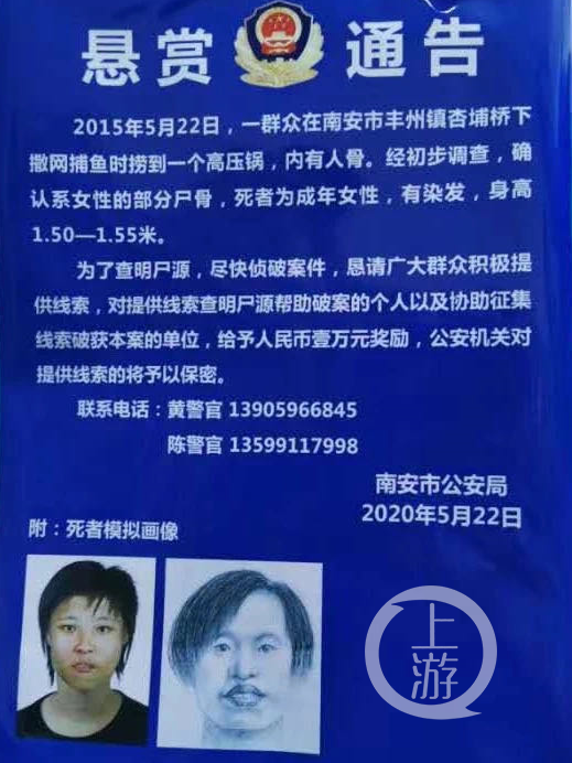 通告称,2015年5月22日,一群众在南安市丰州镇杏埔桥下撒网捕鱼时,捞到一个高压锅,内有人骨。经初步调查,确认死者系女性的部分尸骨,死者为成年女性,有染发,身高1.5米~1.55米。为查明尸源、尽快侦破案件,南安警方恳请广大群众积极提供线索,对提供线索查明尸源或帮助破案的,将给予人民币10000元奖励,公安机关对提供线索的将予以保密。