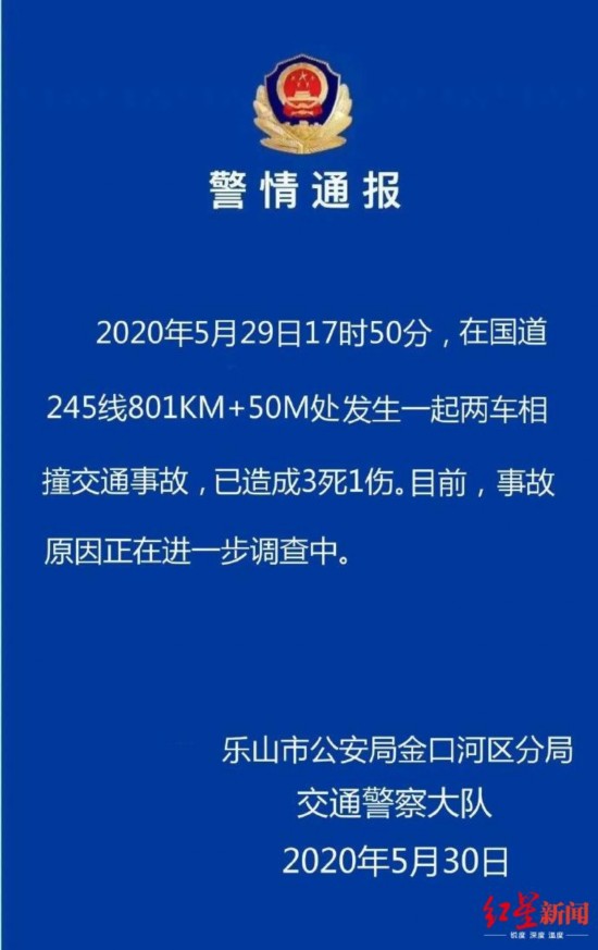 据四川省乐山市公安局金口河区分局官方微博通报,5月29日17时50分,在国道245线801KM+50M处发生一起两车相撞交通事故,已造成3死1伤。目前,事故原因正在进一步调查中。