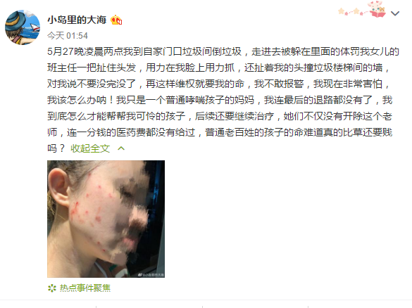 而该网友稍早前在微博表示,5月27晚凌晨两点在自家门口垃圾间倒垃圾时,被涉嫌体罚学生的班主任一把扯住头发,将其脑袋撞向垃圾楼梯间的墙,并威胁再这样维权就要她的命。
