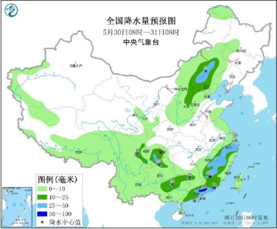 30日至31日江南华南等地仍有较强降水,局地有雷暴大风等强对流天气。受冷空气影响,30日白天至31日,新疆北部和南疆盆地、西北地区东部、华北北部、东北地区等地气温下降4~8℃,局地10℃以上。
