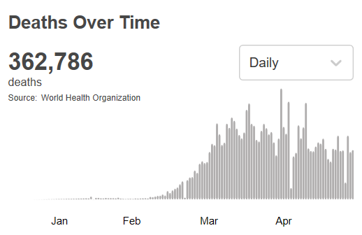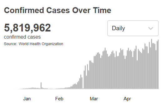 根据世卫组织最新实时统计数据,截至欧洲中部夏令时间5月30日18时30分(北京时间5月31日0时30分),全球确诊新冠肺炎5819962例,死亡362786例。
