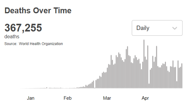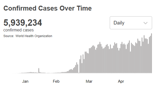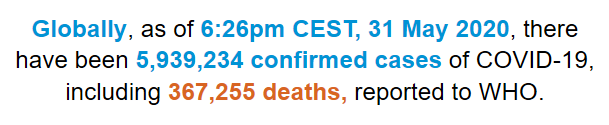 根据世卫组织最新实时统计数据,截至欧洲中部夏令时间5月31日18时26分(北京时间6月1日0时26分),全球确诊新冠肺炎5939234例,死亡367255例。