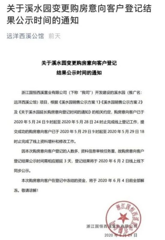 该楼盘项目方表示,由于项目意向客户登记人数多,意向客户登记结果公示日期将顺延3天。