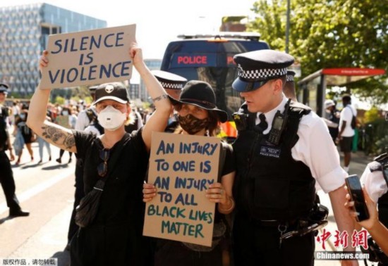 据报道,抗议者们沿着泰晤士河附近的道路游行,最终抵达美国驻英大使馆。他们举着标语牌,上面写着“种族主义没有立足之地”和“我无法呼吸”等,以声援遭美国警察暴力执法的非裔男子弗洛伊德。其中,“我无法呼吸”也是弗洛伊德的遗言。