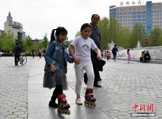 资料图:两个孩童穿一双轮滑鞋玩耍。 中新社记者 翟羽佳 摄