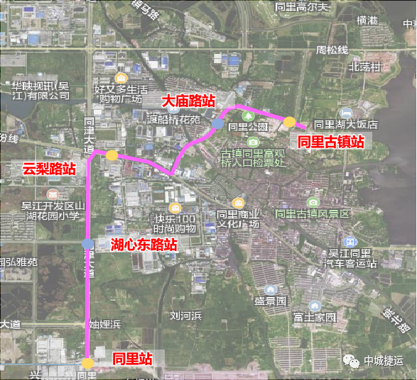 吴江捷运系统T1示范线南起轨交4号线同里站,沿同津大道,至云梨路右转,再转向大庙路,后右转至崇本路,线路全长5.2km。 共设5个站分别是同里站、湖心东路站、云梨路站、大庙站同里古镇站(其中湖心东路站、大庙站为预留站)。