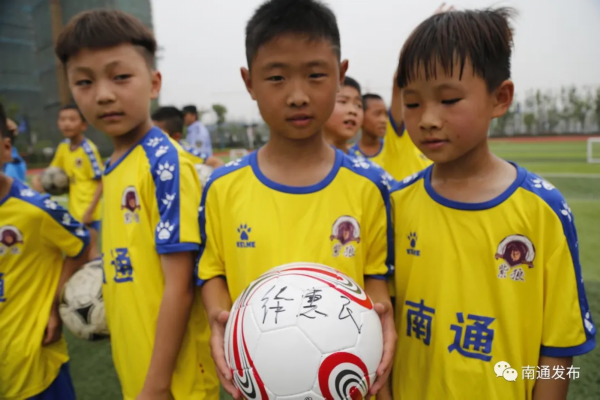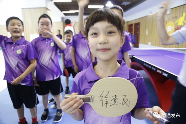 在孩子们的带领下,徐惠民一行参观了儿童美术作品展、紫琅光荣榜、地下宝藏园、阅读馆等。紫琅一小的143名在校生中,一半以上来自省外,大部分学生家长是研究生以上学历,校园种植了全国各省的“省花”“省树”,让孩子们能找到故乡的影子。“你是哪里人?”徐惠民和小讲解员亲切交流。“我爸爸是上海人,妈妈是重庆人,我们来到南通,我的家就在南通。”听了孩子稚气的回答,徐惠民说,很多外来人才拖家携口来到南通,他们是南通高质量发展的生力军,我们要帮他们解决好子女教育等方面的后顾之忧,让他们安心地在南通创业发展。徐惠民一行还驻足观看了“紫狼”足球队和“爬山虎”乒乓球队训练,并在纪念足球和乒乓球拍上签名。