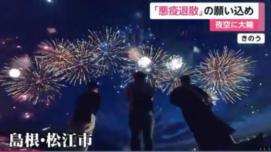 当地时间6月1日晚,为祈愿新冠疫情早日结束,日本多地同时燃放烟花。图为岛根县松江市的民众在观看烟花。(图片来源:日本富士电视台视频截图)